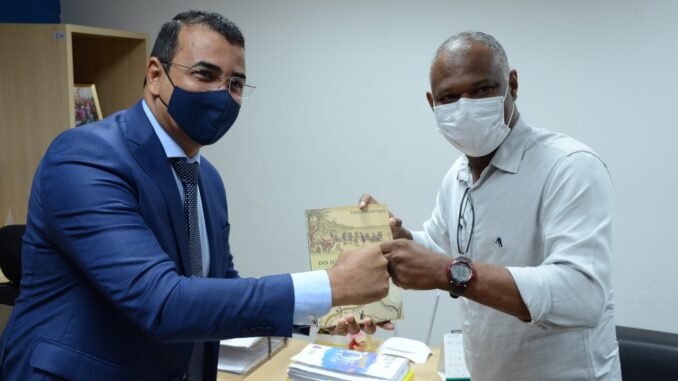 O presidente da Câmara Municipal de Camaçari, vereador Júnior Borges (DEM), recebeu, na manhã desta terça-feira (4/5), na presidência da Casa Legislativa, o historiador camaçariense Diego Copque, que lhe presenteou com o livro “Do Joanes